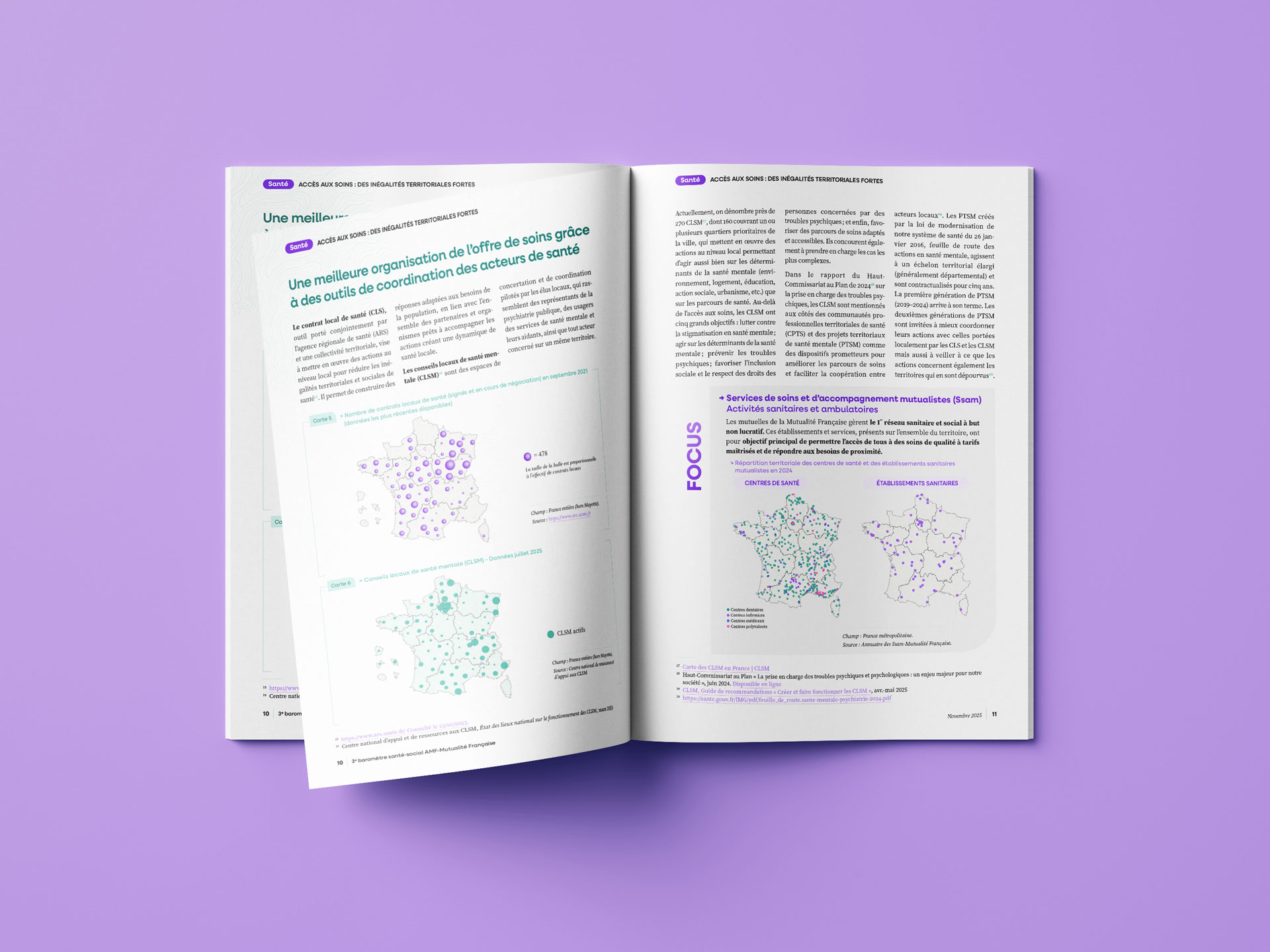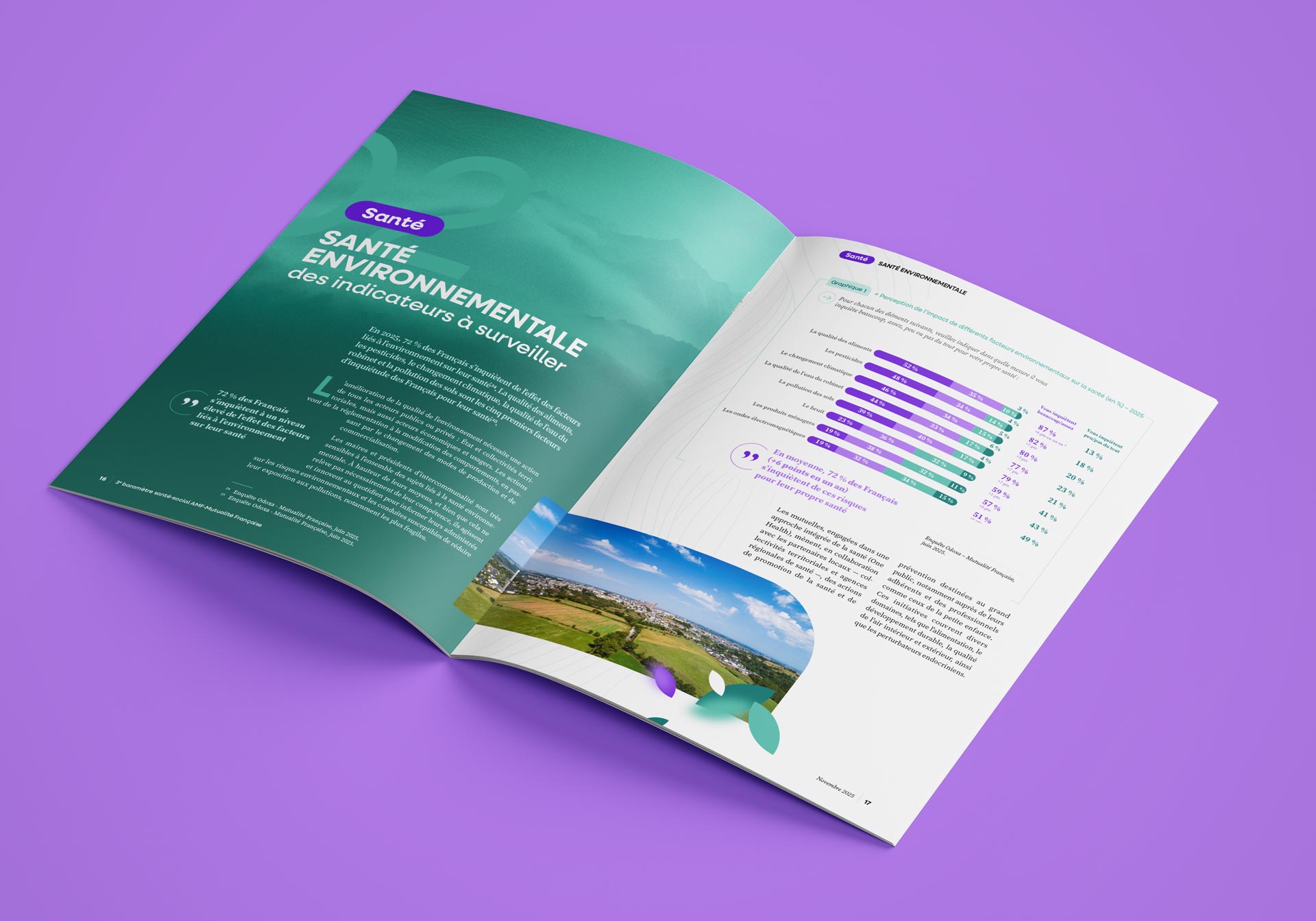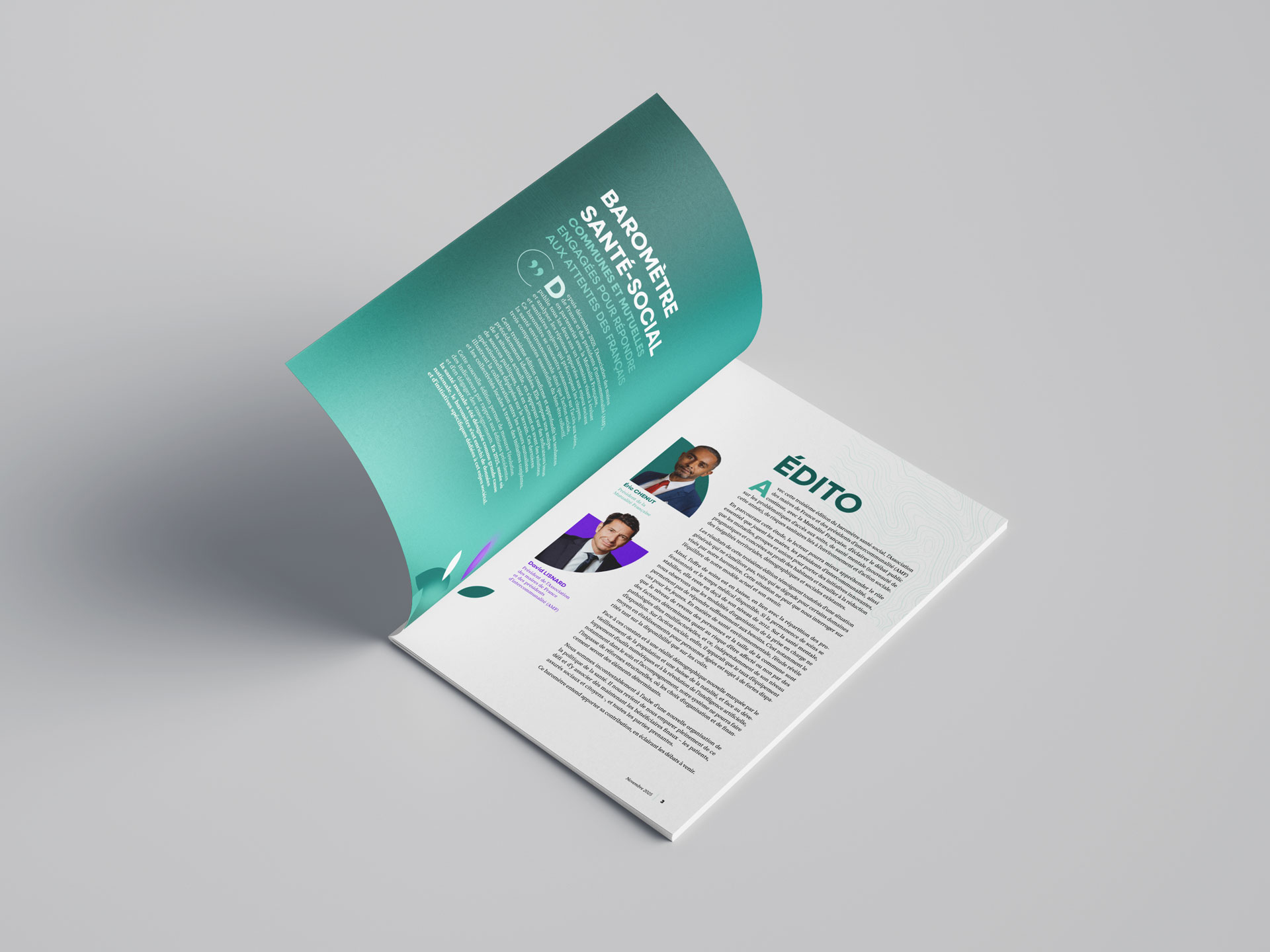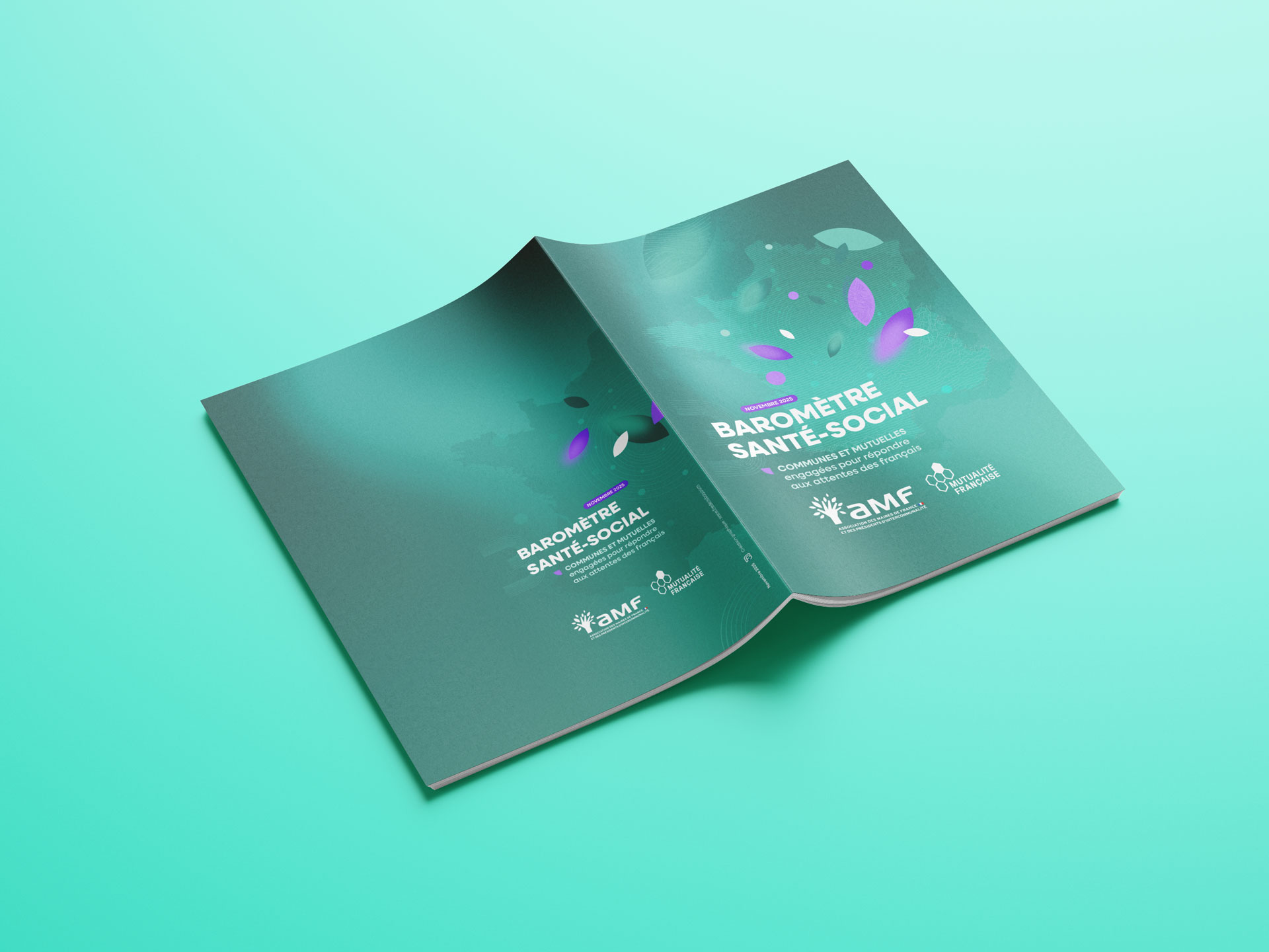 Pour la 3ᵉ édition du Baromètre santé-social, publié par la Mutualité Française et l’Association des maires de France et des présidents d’intercommunalité (AMF), j’ai assuré la création graphique et la mise en page complète du document. Réalisé à partir d’indicateurs publics, ce baromètre dresse un panorama fin des inégalités territoriales en matière d’accès aux soins, de santé environnementale et d’action sociale.