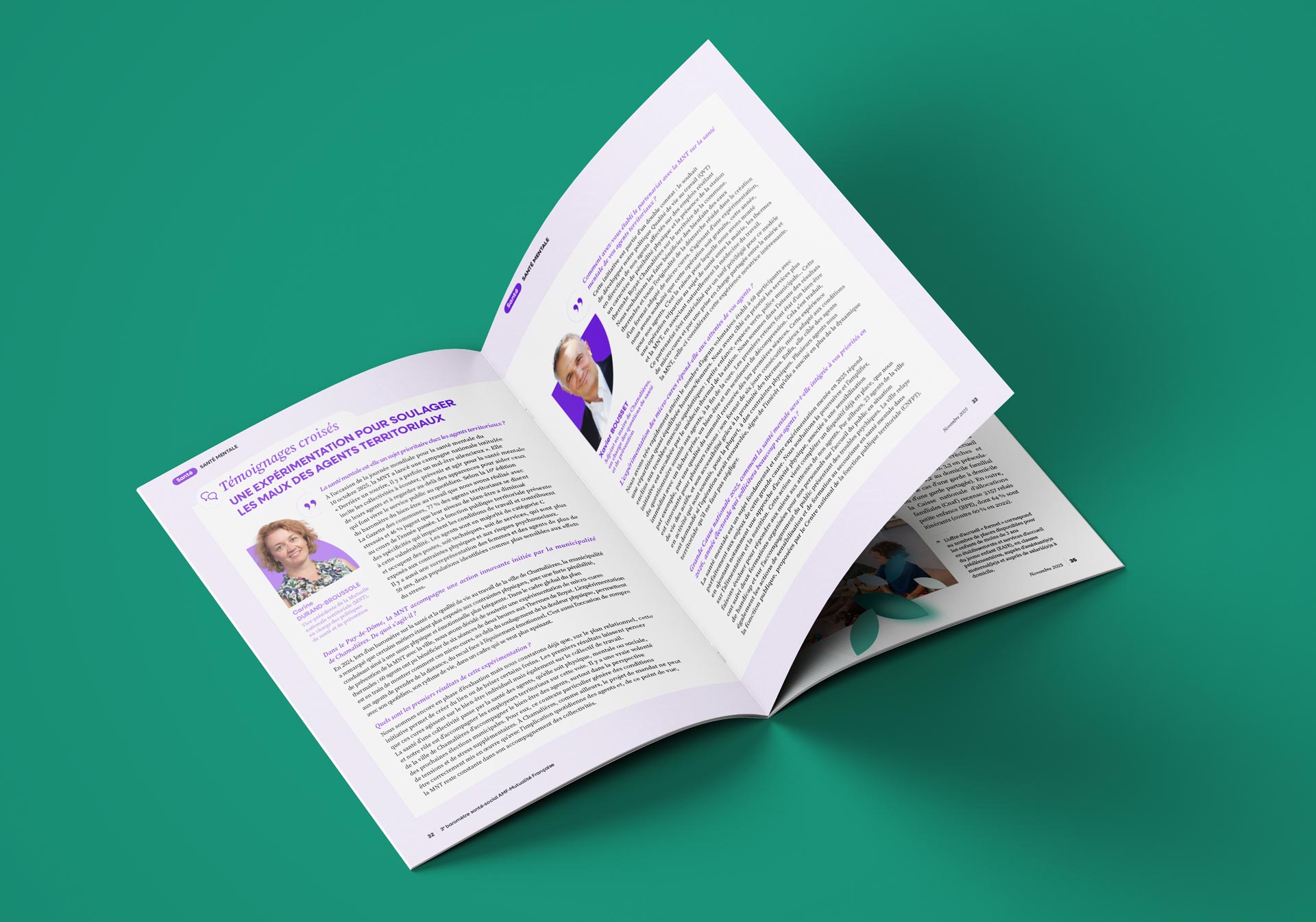 • Direction artistique éditoriale : définition d’un univers graphique institutionnel contemporain, en cohérence avec l’image de la Mutualité Française et de l’AMF, mais avec une identité propre à cette édition 2025. Hiérarchie typographique précise, codes couleur stables, repères visuels récurrents pour guider la lecture tout au long du document.